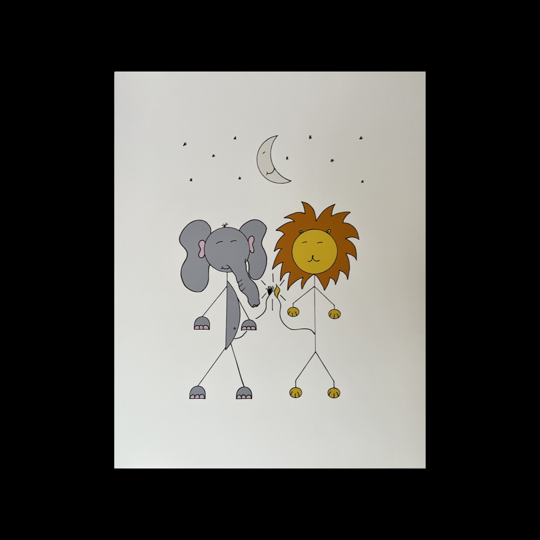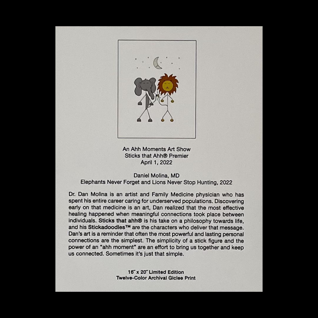 Celebrate the Sticks that Ahh® brand launch and inaugural art show with this limited edition 16" x 20" giclee print of "Elephant and Lion". Only 30 of these Stickadoodle™ prints were made, each number and hand signed by the artist.
